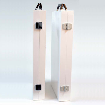 イクイリブリアム50ml用キャリングケースは1台の大きさが縦60cm、横36cm、厚さ9cmとなっており、2台で全140本を挿入する事が出来ます。(1台の重さ約1.5kg)