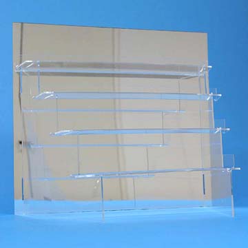 折りたたみ式で透明アクリル4段のひな壇とバックがプラスティック鏡となっております。分解でき持ち運びに便利です。